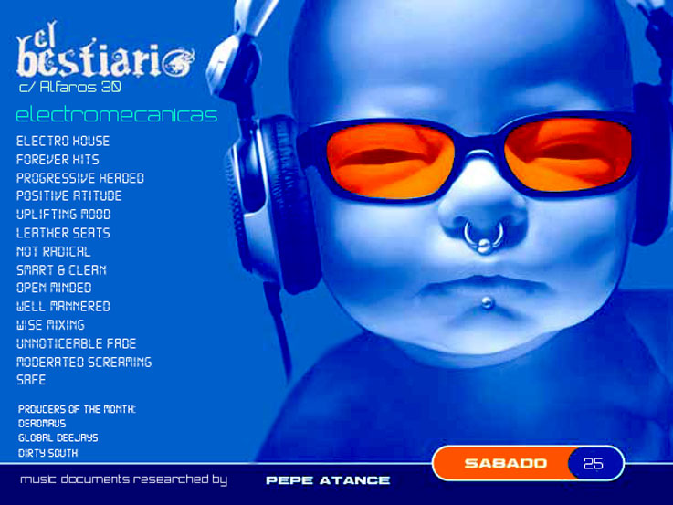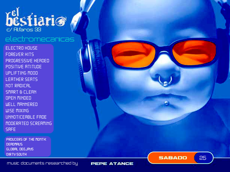 La semana próxima el sábado 25 a partir de las 12:00 h en El Bestiario, C/ Alfaros 33, una nueva sesión : ELECTRO-MECÁNICAS. House recien salido del horno de una casa abierta, sin enaltecimientos, bien pensado, respetuoso con el medio, progresivo, no radical, limpio, positivo, diivertido, catalizado a través de grandes éxitos de la música, remezclados con un sonido contemporáneo y muy válido para el disfrute de 3 generaciones, en el 2008.