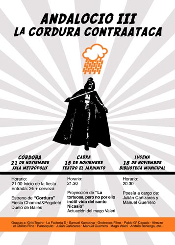 El colofón a esta celebración será viernes 21 de noviembre, a las 21:00 horas en Córdoba, con el estreno en la Sala Metrópolis de la opera prima del cordobés Miguel Ángel Sánchez, CORDURA. Un acto en el que los organizadores contarán con la presencia de un buen número de artistas cordobeses como Grotescos Films, Asociación Atrezzo, la compañía Casi que sí, Gritoteatro, EL chillíito Flins, Pansequito, Kamboya, La Factoría D y Andrés Berlanga, entre otros.