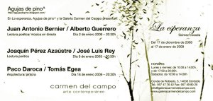 «Hola amigos/as, este sábado por la mañana día 17 de enero acaba mi exposición La esperanza, y para despedirla os proponemos el último encuentro de Agujas de pino dentro de la Galería Carmen del Campo. Será el viernes 16 a las 20:30h. Contaremos con la presencia de Paco Daroca y Tomás Egea, que charlarán sobre Arquitectura y pintura, dando también la palabra al público asistente.»