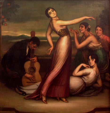 En estos años Romero de Torres se ha consolidado como pintor. Conoce a la perfección la técnica, la cual pone de manifiesto en el empleo de la línea y del color. Vemos en esta obra una magistral composición con la figura femenina del centro como protagonista. Detrás, en segundo plano, aparecen otras figuras femeninas y un hombre que toca la guitarra. El tema es la copla y el flamenco, que aparece también en: Malagueñas, Seguidillas, Cante hondo, La copla, La Saeta y Carcelera. La escena, captada a la manera de un tablao flamenco, utiliza como fondo el campo. Los ropajes y zapatos son representados de un modo sublime. Al igual que en otras muchas obras del pintor aparecen aquí las naranjas.