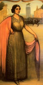 En este caso la mujer que aparece está en actitud marcial, en consonancia con el nombre de la obra, mientras que al fondo unos jinetes se colocan por delante de la estatua del Gran Capitán y de una construcción arquitectónica en la que se mezclan la Mezquita y la portada de la casa de los Páez.