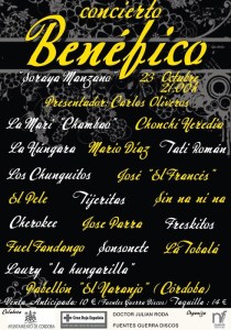 Mi amigo Tano Fernández, pianista flamenco de pro, andaba desde hace días liadísimo organizando junto a Paqui, su mujer, este concierto benéfico para ayudar económica y moralmente en lo posible a un familiar suyo ( Soraya Manzano) que padece cáncer y aquí hacemos eco para que se entere más gente y acudan, ya que aparte de la labor que ya hemos mencionado se trata de un concierto excepcional por la cantidad de artistas que se han involucrado en él y seguro que harán pasar una noche muy entretenida y llena de flamenco del mejor a todos los asistentes.