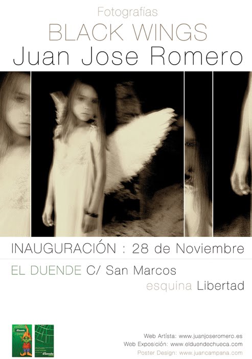 El fotógrafo cordobés y amigo nuestro Juan José Romero, al que debemos la serie de fotografías » Nuestra Alegre Juventud» que documentaba el ambiente musical y artístico de los 80 en Córdoba y que generosamente nos envió para comenzar a conformar nuestra colección, expone en Madrid en ‘El Duende’ , C/ San Marcos esquina con Libertad. Se trata de una serie de 15 fotografías en blanco y negro titulada «Black Wings» parte de su reciente actividad, que no es poca y entre las que podemos destacar el trabajo para el recién estrenado disco de Vicente Amigo.
