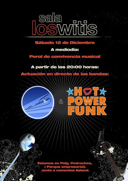 Mañana Sábado día 12, actuarán en doble sesión y compartiendo escenario las bandas cordobesas Chopep Pop y Hot Power Funk en la Sala Los Witis situada en el parque indutrial Pedroches, que para los que no lo sepan está pasando Asland. Por la mañana tendrá lugar un perol de convivencia previo a las actuaciones y al cual estamos todos invitados. Conociendo el buen hacer de ambas formaciones, la noche promete ser muy divertida y llena de buena música y buen rollo.