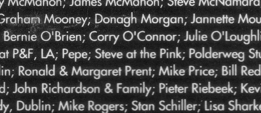 Y ahí, entre cientos de alusiones a personajes, fans y profesionales de la música, estaba mi nombre seguido de el de Steve. Me alegró, pero lo consideré una coincidencia, ya que nunca me hubiese dado cuenta de ello de no ser por el amigo que pacientemente leyó la interminable lista de agradecimentos y me lo sopló. Más tarde me lo confirmaba Steve, que me dió créditos como buen dj de rock ya que era verdad que una buena parte de la noche satisfacía las borracheras de los presentes con temazos clásicos e intachables de la historia del rock mundial.
