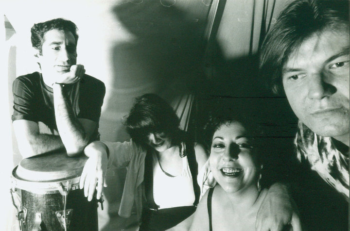 A la derecha aparece posando sobre una tumbadora cubana cuando colaboraba con el grupo de Miguel Ortiz.